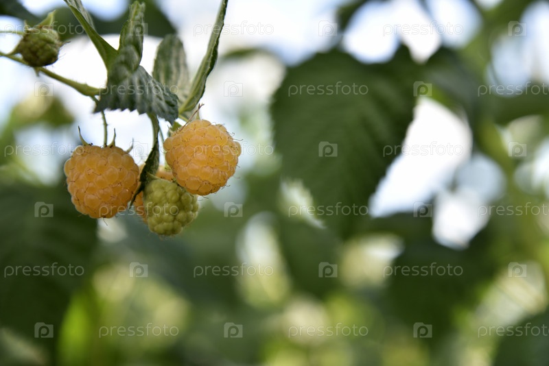 Желтая большая малина на зеленом кусте. Вкусная редкая желтая малина в летнем саду