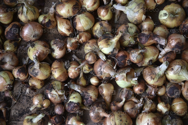 Свежевыкопанные плоды лука осенью. Сбор лука