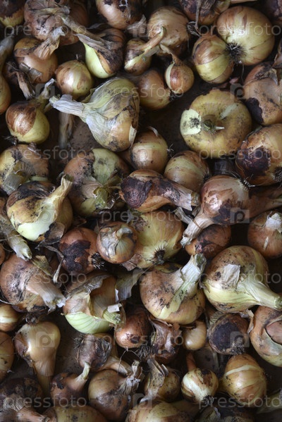 Свежевыкопанные плоды лука осенью. Сбор лука