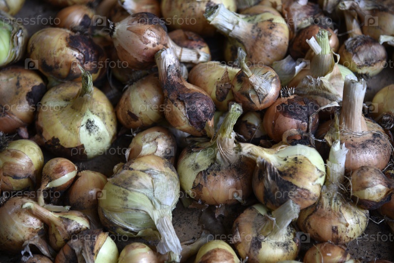 Свежевыкопанные плоды лука осенью. Сбор лука