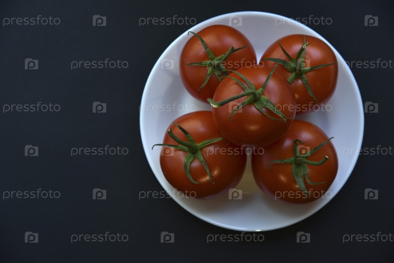 Красные сочные помидоры на белой тарелке. Вкусные помидоры на черном фоне