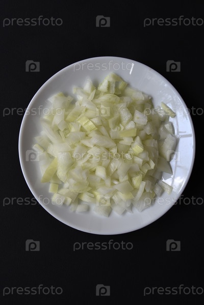 Сочный лук в белой тарелке на черном фоне. Вкусный нарезанный лук в миске