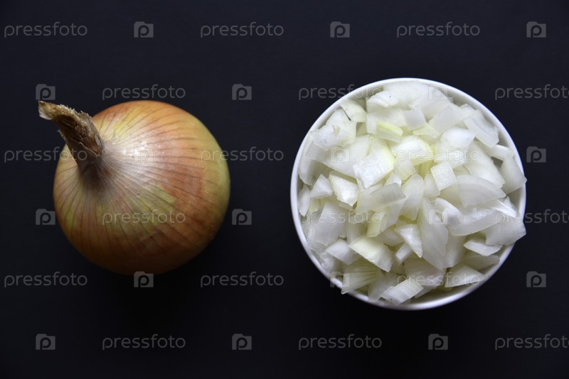 Нарезанный лук на тарелке и лук на черном фоне. Лук на черном фоне и на тарелке