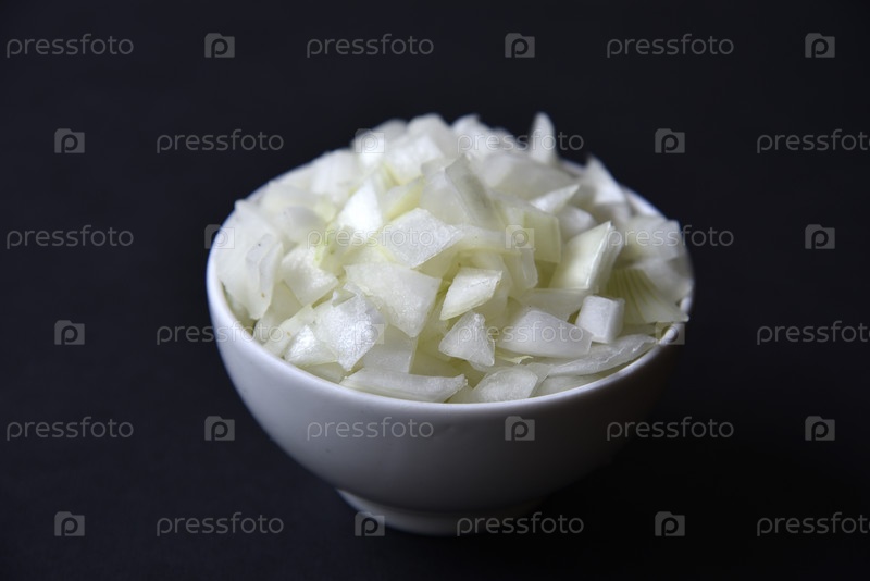 Сочный лук в белой тарелке на черном фоне. Вкусный нарезанный лук в миске