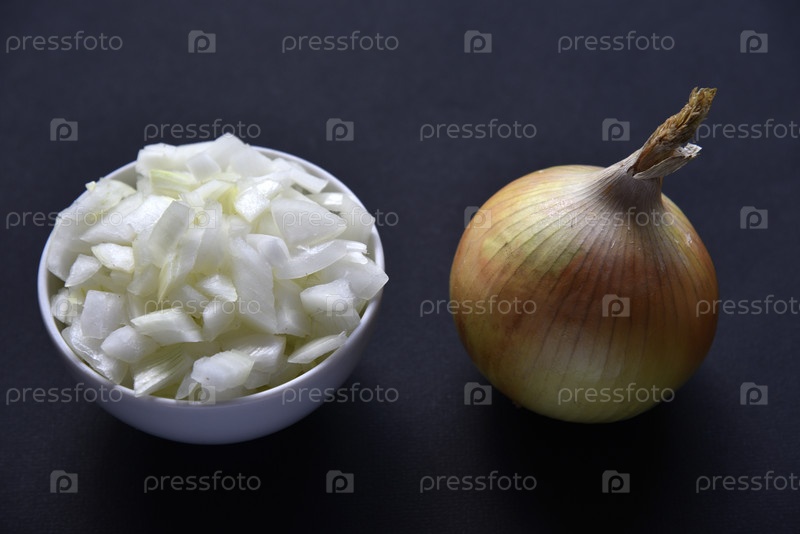 Нарезанный лук на тарелке и лук на черном фоне. Лук на черном фоне и на тарелке