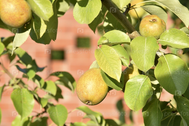 Спелые плоды груши на дереве в листве осенью в саду. Сочные груши в летнем саду