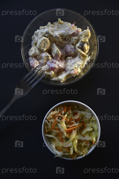 Вкусный салат из майонеза и овощей в тарелке. Салаты из мяса и овощей на черном фоне