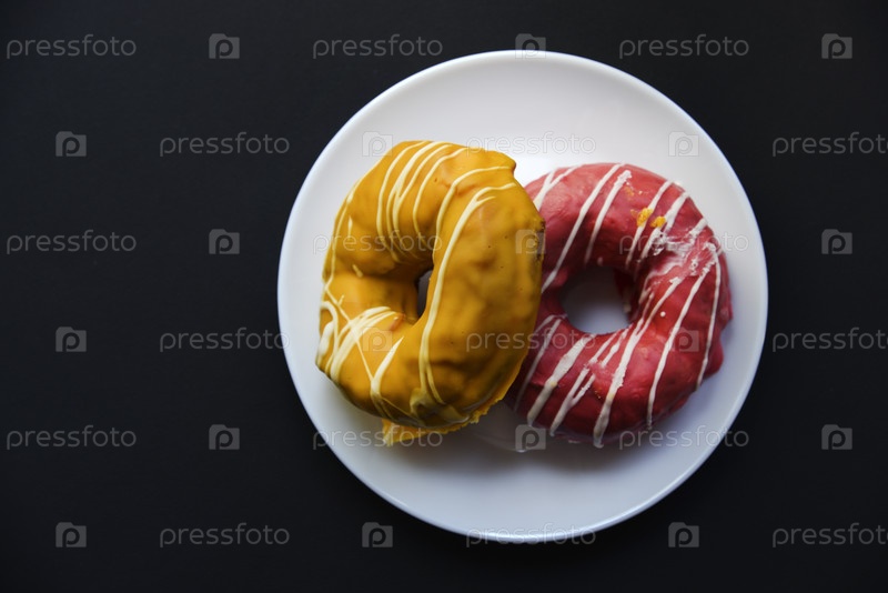 Сладкие пончики пончики на белой тарелке. Американские вкусные и сладкие пончики