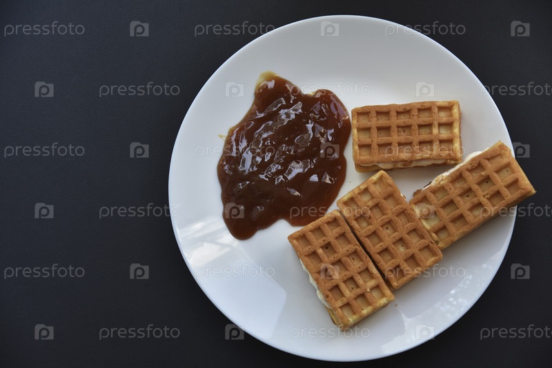Вкусные венские вафли с вареньем на белой тарелке. Сладкий завтрак из венских вафель