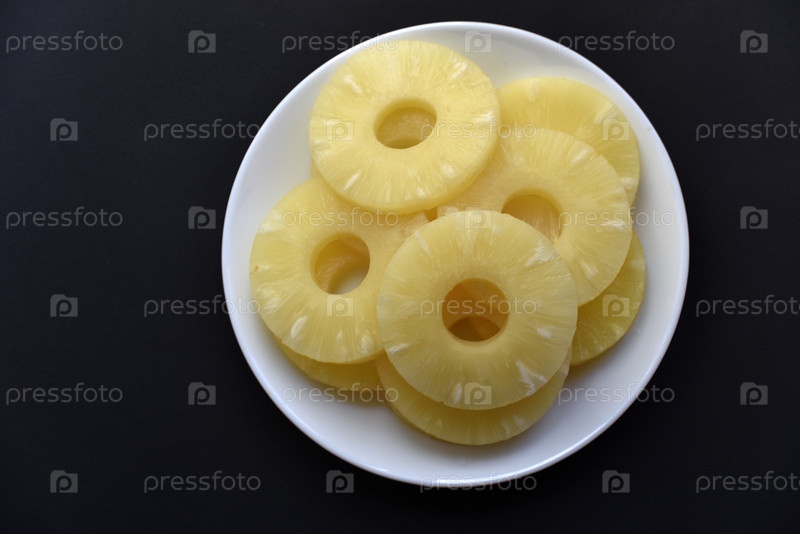 Вкусные свежие кольца ананаса на тарелке на черном фоне. Вкусный завтрак из ананасовых колец