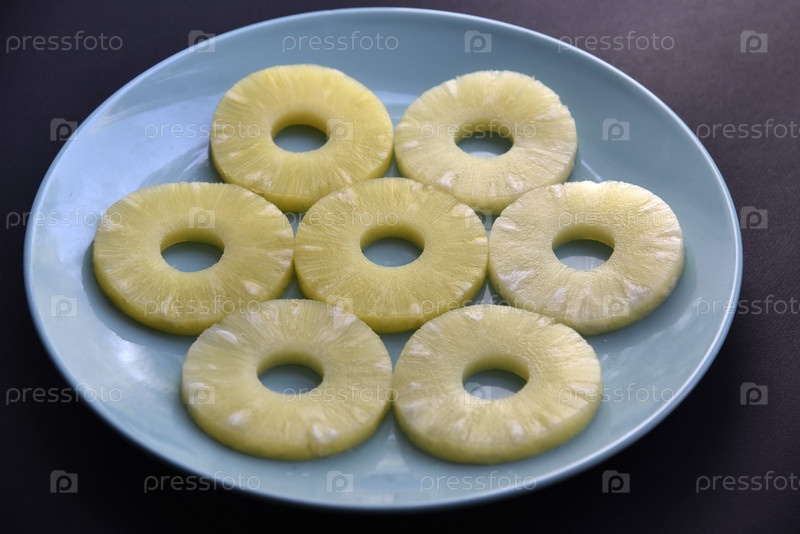 Вкусные свежие кольца ананаса на тарелке на черном фоне. Вкусный завтрак из ананасовых колец