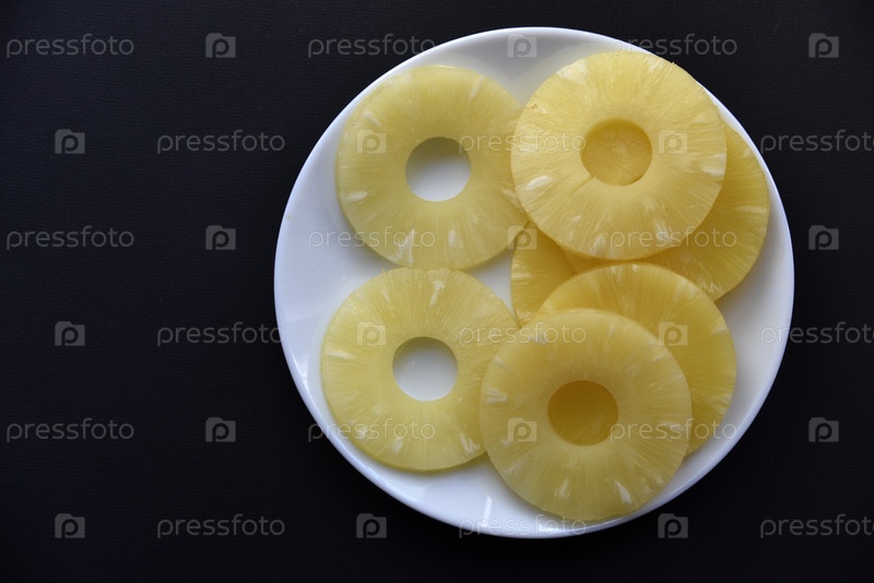 Вкусные свежие кольца ананаса на тарелке на черном фоне. Вкусный завтрак из ананасовых колец