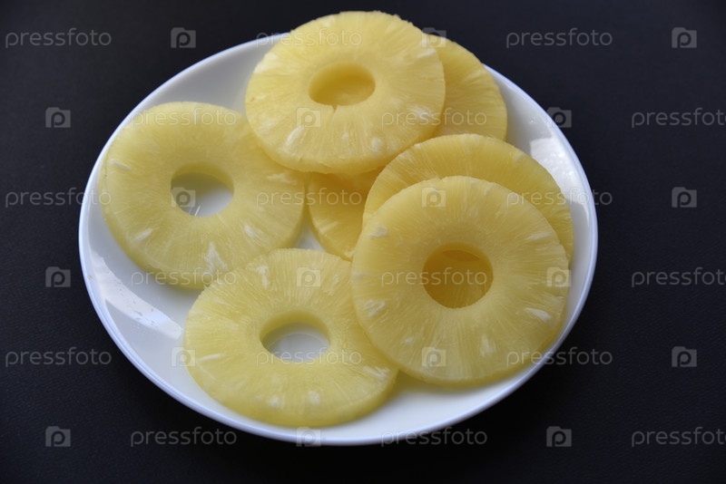 Вкусные свежие кольца ананаса на тарелке на черном фоне. Вкусный завтрак из ананасовых колец