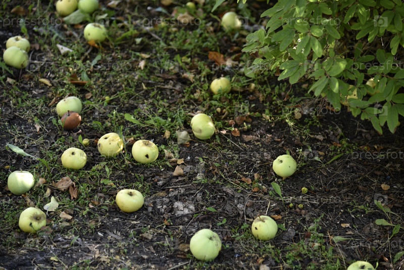 Гнилые яблоки на земле упали с яблони осенью. Земля покрыта опавшими яблоками