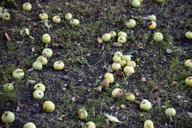 Гнилые яблоки на земле упали с яблони осенью. Земля покрыта опавшими яблоками