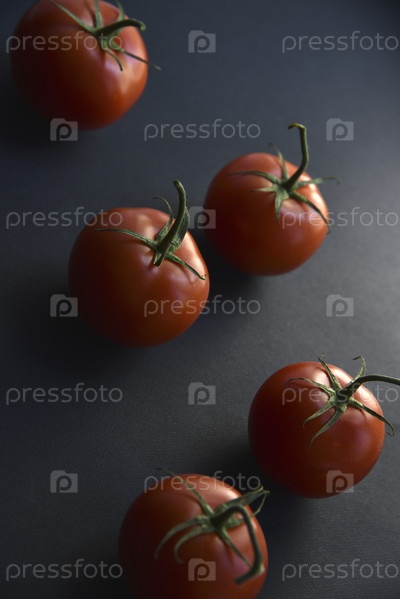 Несколько вкусных красных помидоров подряд на черном фоне. Сочные красные помидоры крупным планом