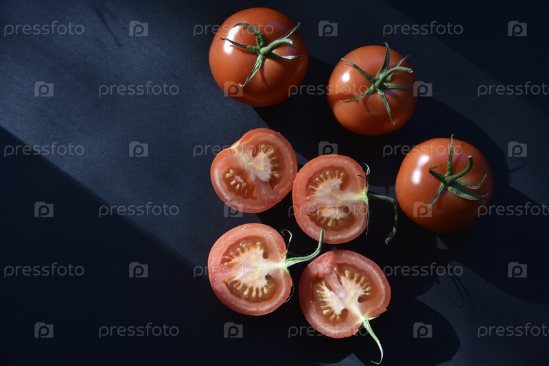 Нарезанные и целые помидоры на черном фоне. Сочные и вкусные помидоры крупным планом