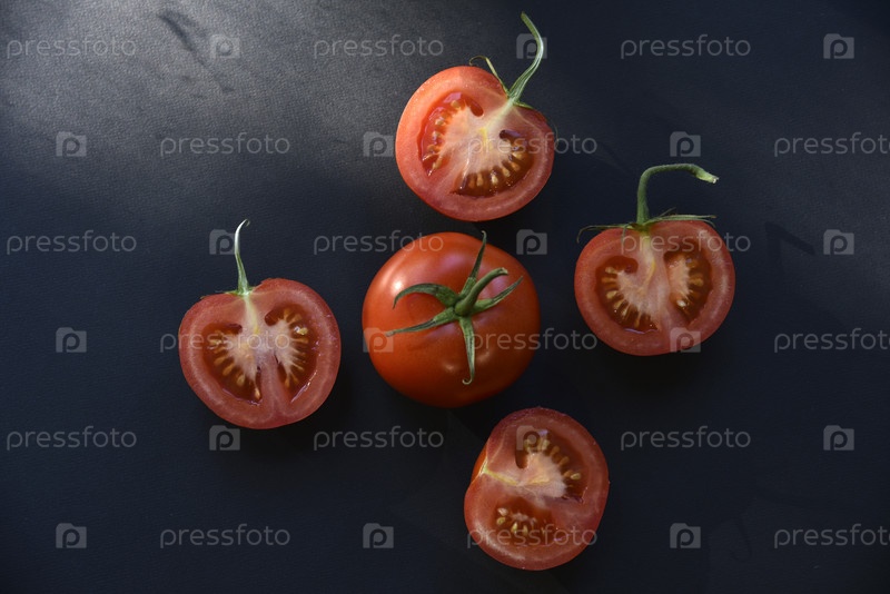 Нарезанные и целые помидоры на черном фоне. Сочные и вкусные помидоры крупным планом