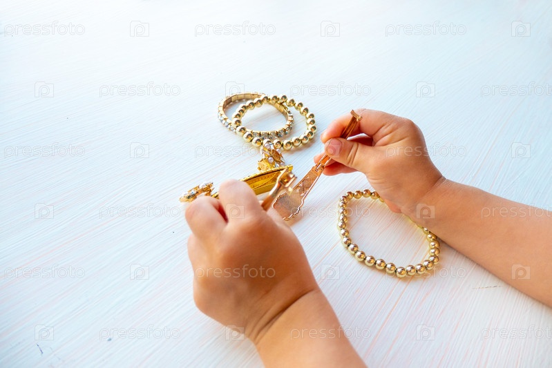 Детские руки играют с золотыми украшениями и бижутерией, на белом фоне. концепция женского счастья