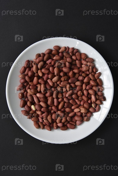 Арахис на белой тарелке на черном фоне. Вкусный ореховый завтрак