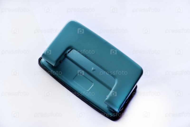 Белый степлер и зеленый дырокол на белом фоне. Канцелярские товары на белом фоне