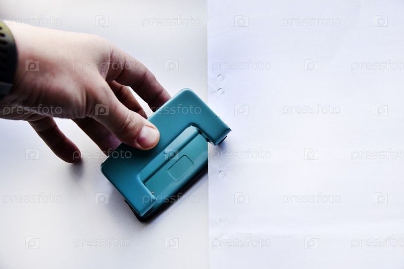 Зеленый дырокол в руке на белом фоне. Канцтовары крупным планом