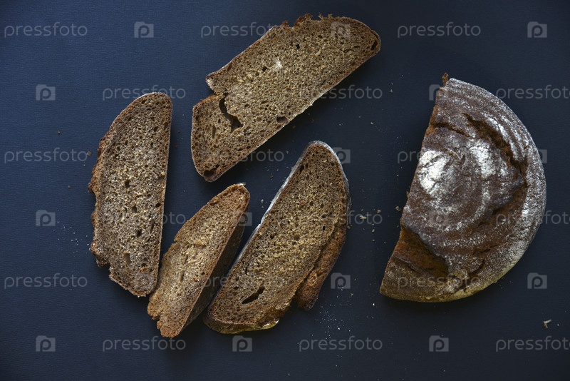 Нарезанный черный хлеб на черном фоне. Буханка черного хлеба с ломтиками крупным планом
