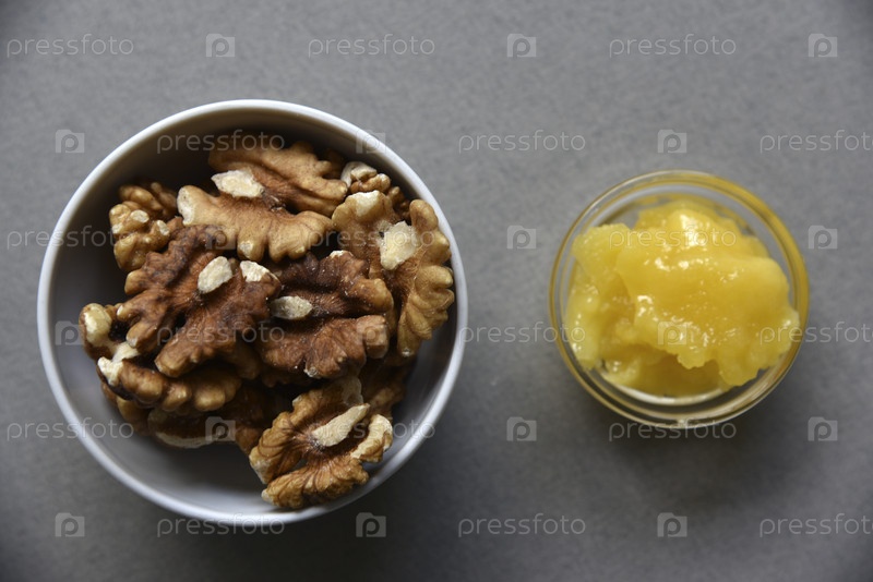 Вкусные грецкие орехи кешью и фундук с медом на сером фоне. Вкусные орехи в керамических блюдцах и мед