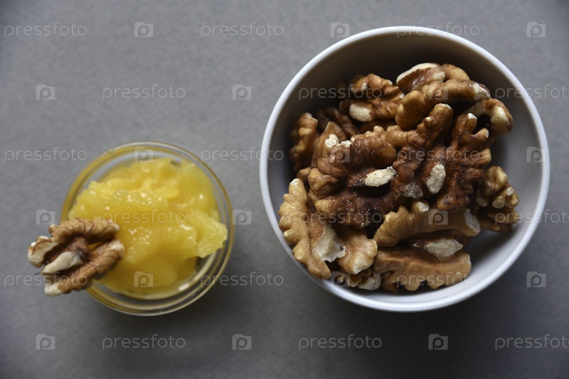 Вкусные грецкие орехи кешью и фундук с медом на сером фоне. Вкусные орехи в керамических блюдцах и мед