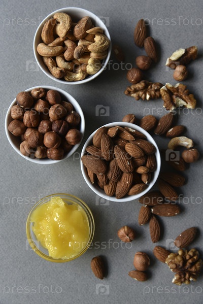 Вкусные грецкие орехи кешью и фундук с медом на сером фоне. Вкусные орехи в керамических блюдцах и мед