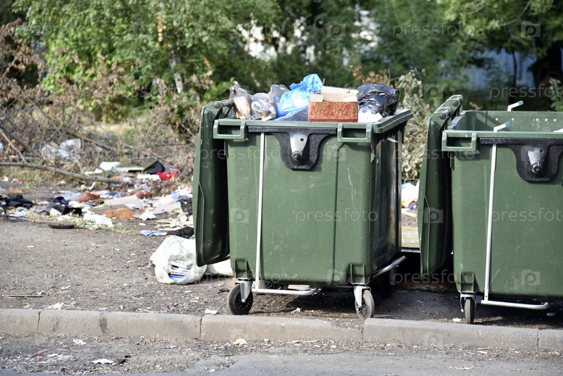 Мусорные баки в городской местности и на свалке. Пластиковые мусорные контейнеры в деревне
