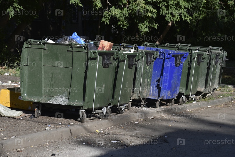 Мусорные баки в городской местности и на свалке. Пластиковые мусорные контейнеры в деревне