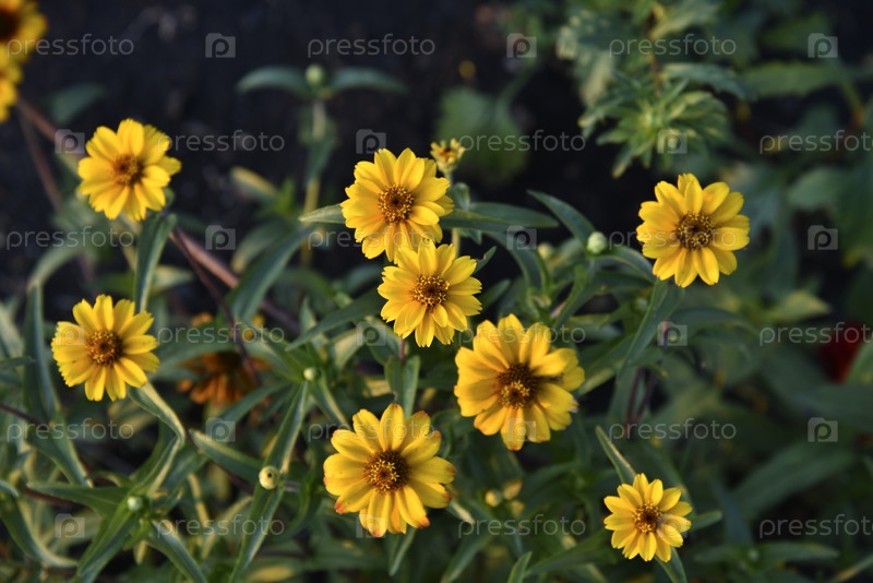 Красные и желтые цветы цинии в летнем саду на вечернем солнце. Циния крупным планом вечером