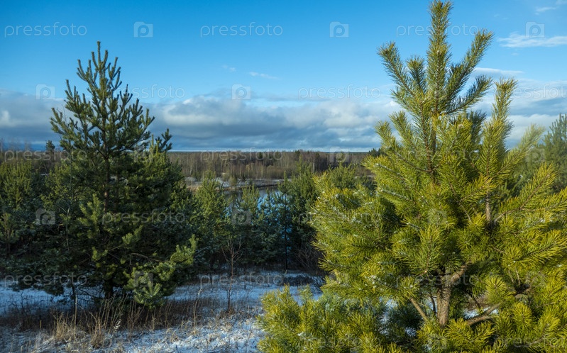 Весенний пейзаж с красивым озером с елями и последним снегом на фоне облачного неба