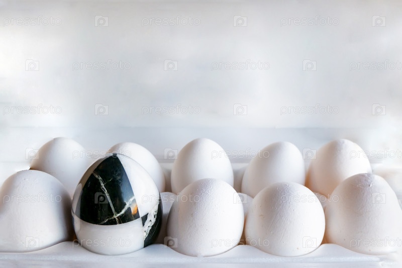 Яйца разных цветов в картонных коробках. мраморное каменное яйцо на фоне белых куриных яиц