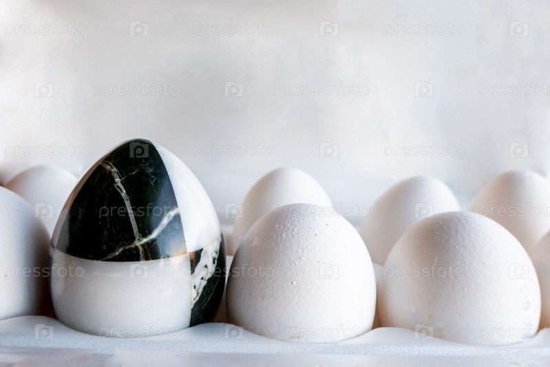 Яйца разных цветов в картонных коробках. мраморное каменное яйцо на фоне белых куриных яиц