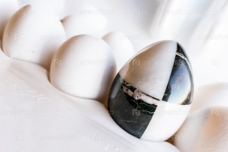 Яйца разных цветов в картонных коробках. мраморное каменное яйцо на фоне белых куриных яиц