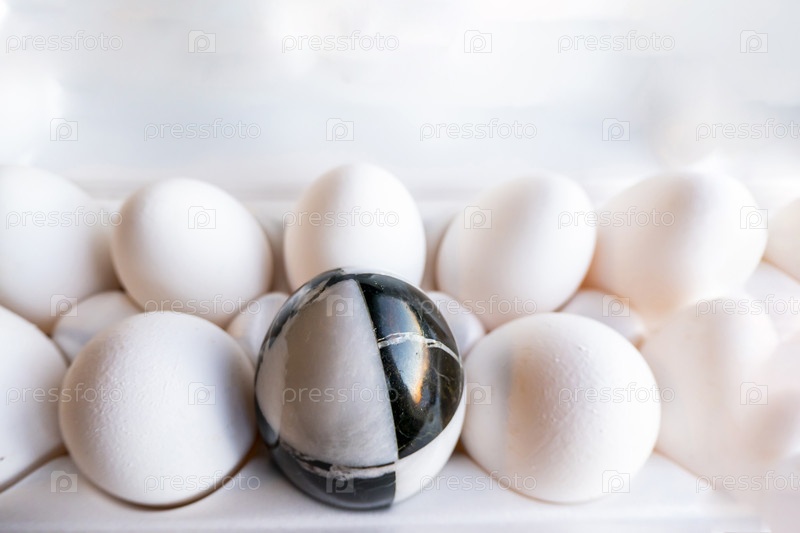 Яйца разных цветов в картонных коробках. мраморное каменное яйцо на фоне белых куриных яиц