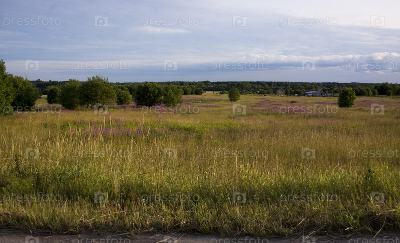 Красивый пейзаж Русского Севера в Ленинградской области Летний пейзаж с пасмурным небом и цветущим иван-чаем в Ленинградской области