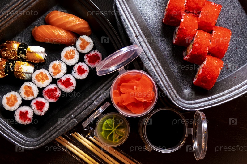 Набор вкусных суши-роллов с вассаби и имбирем в коробке. Японская еда