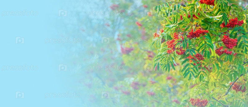 Ветки рябины с красными ягодами баннер. Осень и естественный фон. Осеннее знамя с ягодами и листьями рябины. Скопируйте пространство
