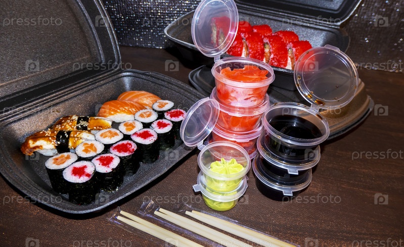 Набор вкусных суши-роллов с вассаби и имбирем в коробке. Японская еда