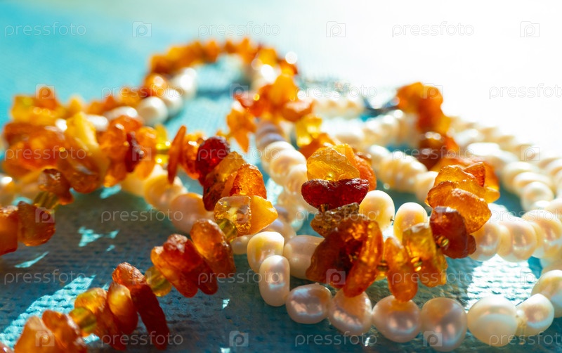 Солнечные бусины из янтарного жемчуга лазурита на синем фоне. Фон солнечного света из природного морского драгоценного камня, концепция ювелирных изделий