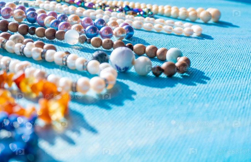 Куча цветных ярких ювелирных бусин на синем фоне. Ожерелье из бусин разных драгоценных камней. Драгоценное ожерелье современная мода узор или текстура. копировать пространство