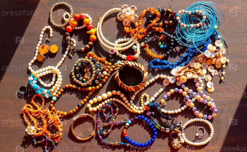 Много бижутерии с разными материалами на черном фоне