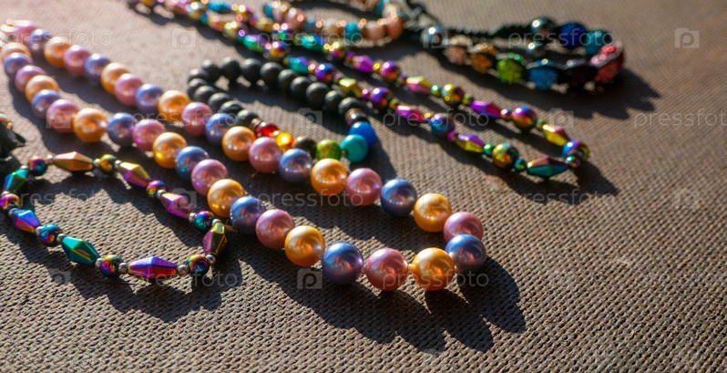 Куча цветных ярких ювелирных бусин на темном фоне. Ожерелье из бусин разных драгоценных камней. Драгоценное ожерелье современная мода узор или текстура. ювелирный фон