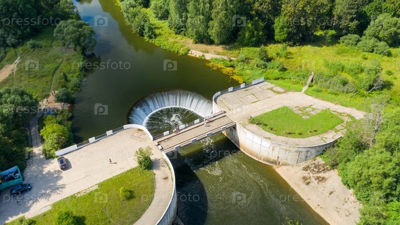 Вид с воздуха на водосбросную плотину первой в СССР сельской ГЭС в деревне Ярополец, вид сверху, Волоколамский район Московской области