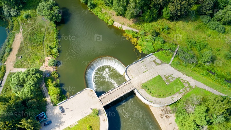 Вид с воздуха на водосбросную плотину первой в СССР сельской ГЭС в деревне Ярополец, вид сверху, Волоколамский район Московской области