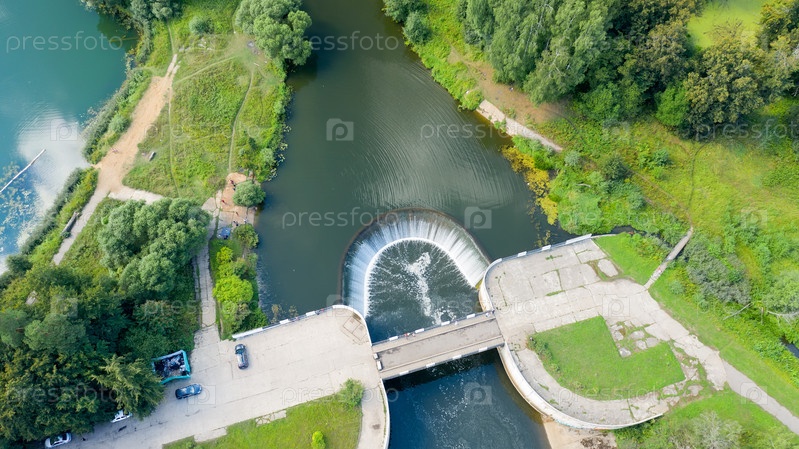 Вид с воздуха на водосбросную плотину первой в СССР сельской ГЭС в деревне Ярополец, вид сверху, Волоколамский район Московской области