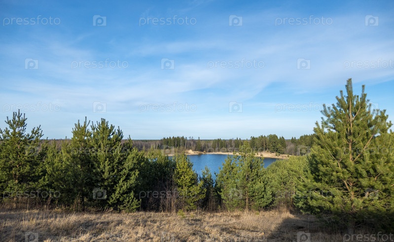 Летний пейзаж с красивым озером с елями на фоне облачного неба